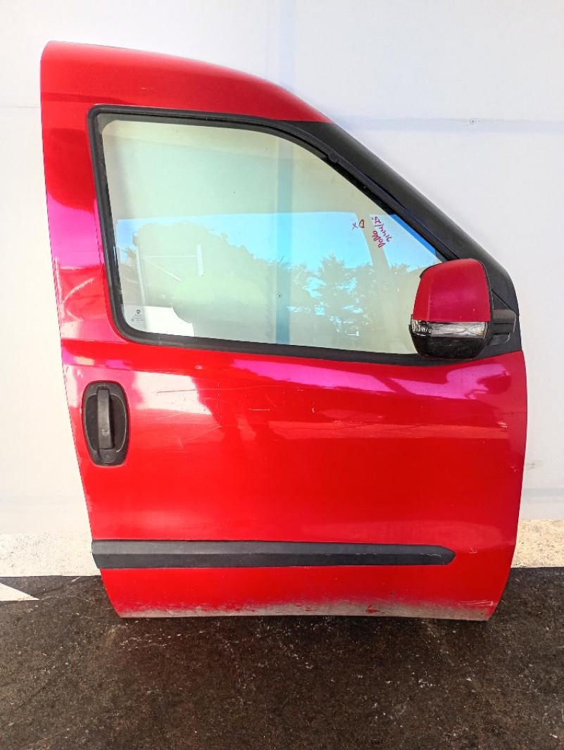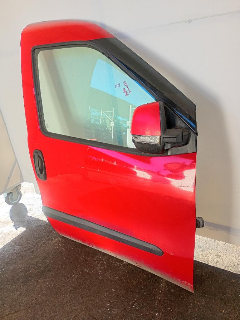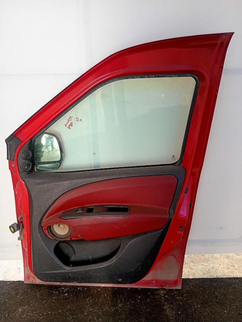 Porta / Portiera Anteriore Destra Fiat Doblò 2009 – 2015, di colore rosso, con modanatura, compresa di maniglia,specchietto e pannello interno.
